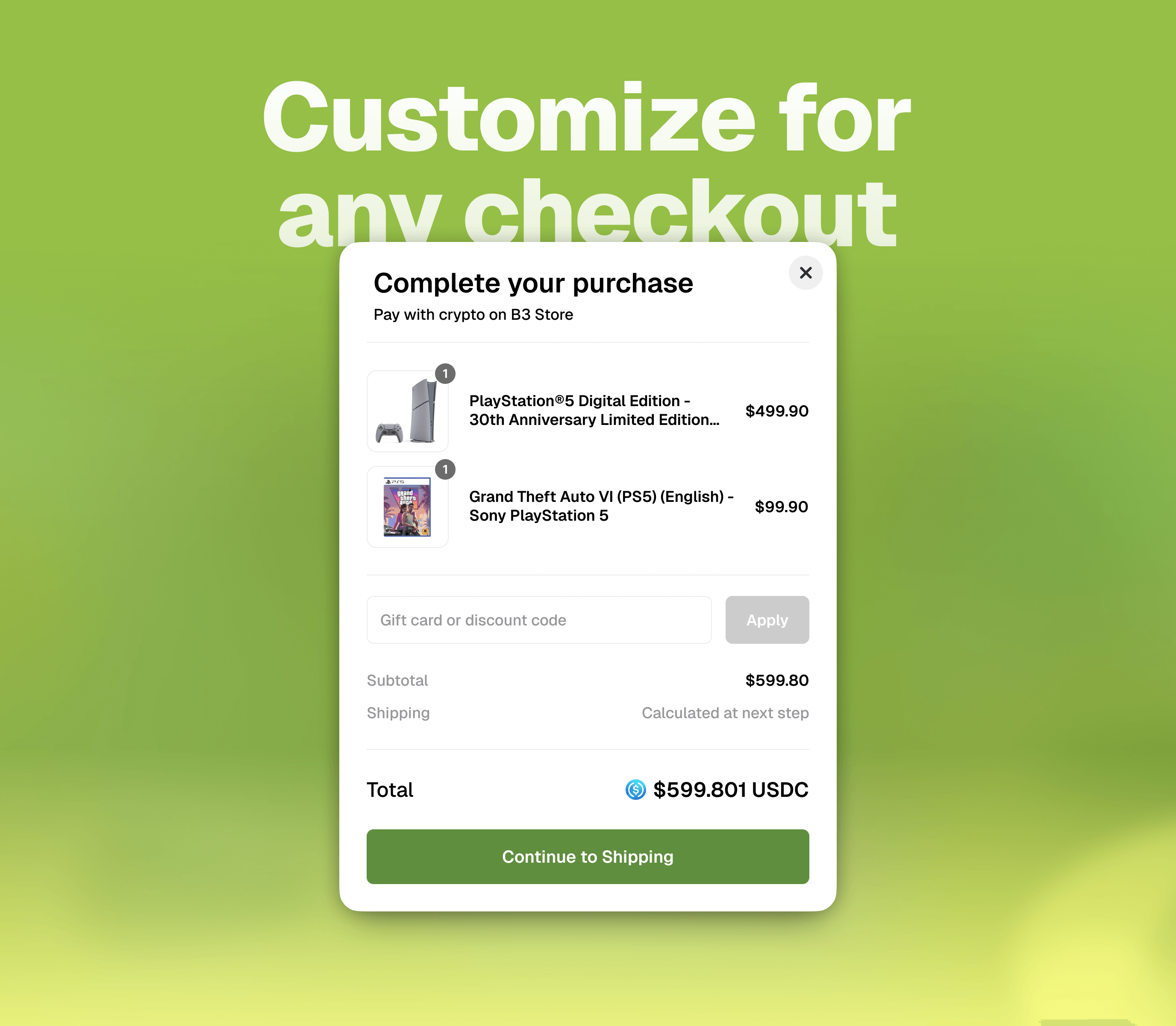One-click checkout that accepts any token as payment, with automatic conversion.