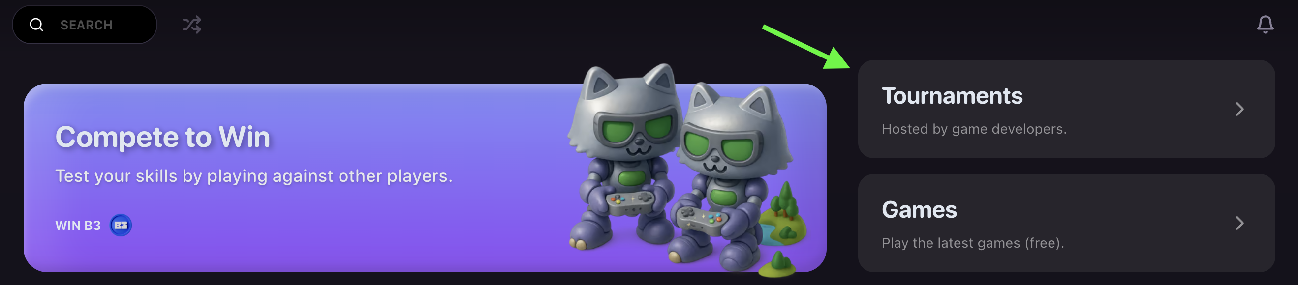 Select Live Tournaments to view ongoing competitions. Browse the list of active tournaments and select the one you want to join. Click Join Tournament to open the tournament details page.