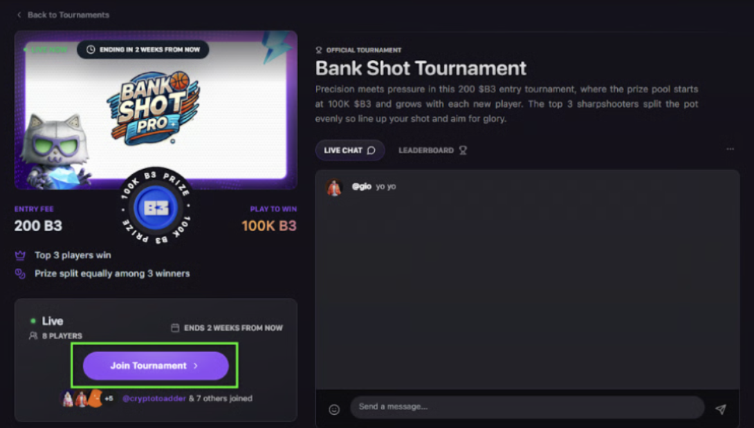 Here you can review the rules, prize pool, leaderboard, and time remaining. You can also chat with other players in Live Chat. If you’re ready to compete, click Join Tournament again to confirm your entry.