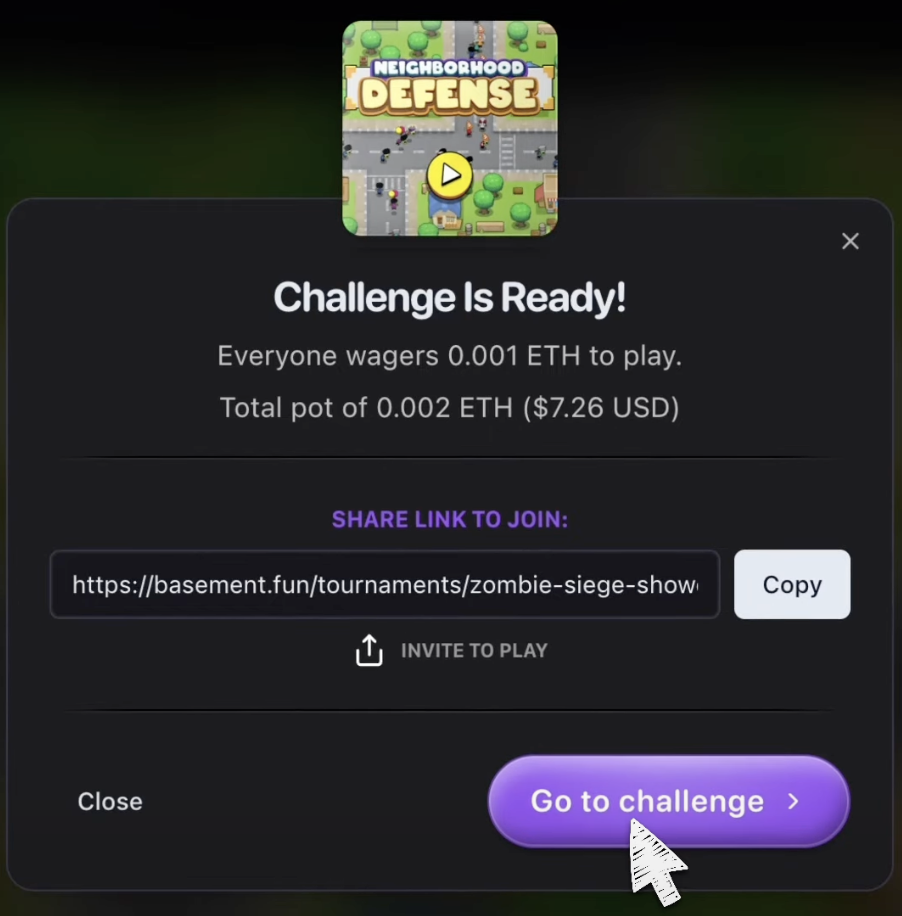Once your wager challenge has been funded, you will be provided with a link to share with your opponent. Click Copy to copy the link for sharing. Your friend/opponent will need to open the link, confirm their stake, and join the wager challenge.