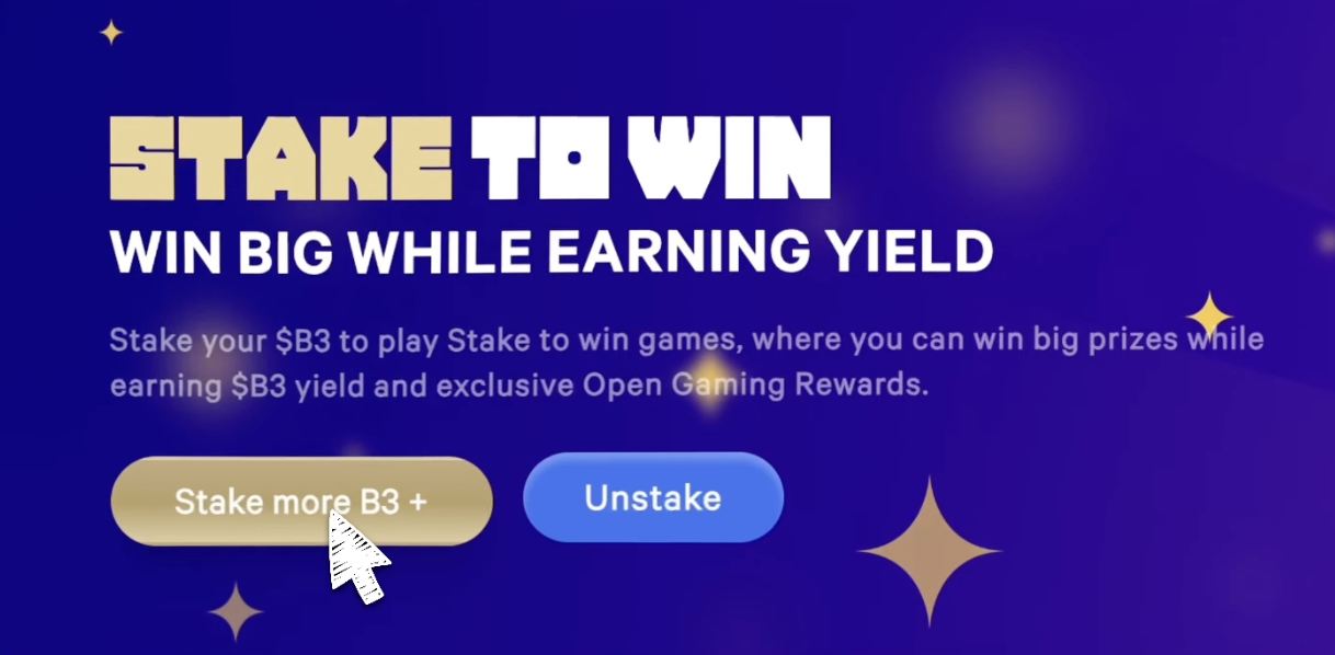 The minimum staking amount is 50 B3. Once staked, your tokens will immediately start earning passive rewards and unlock access to Stake to Win games.