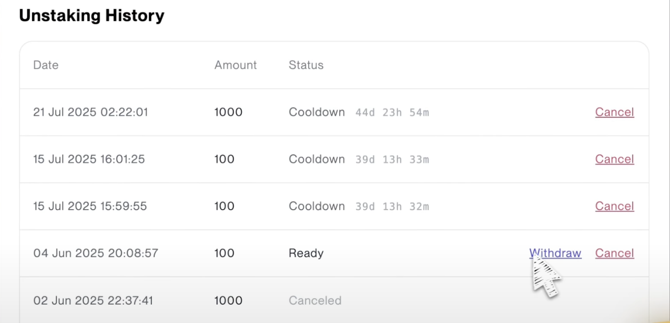 Confirm the transaction in your wallet to complete the first half of the unstaking process. Once complete, your tokens will enter a 45-day cool-down period. During this time, you must wait 45 days before you can withdraw your tokens from the pool.